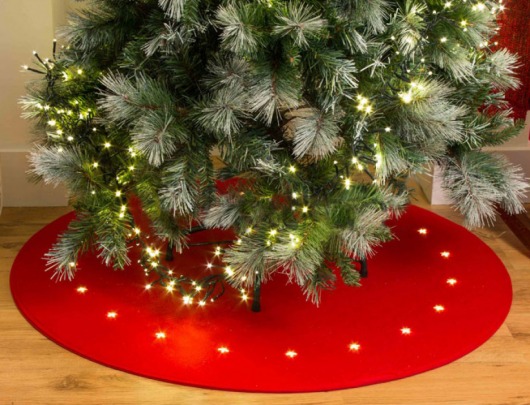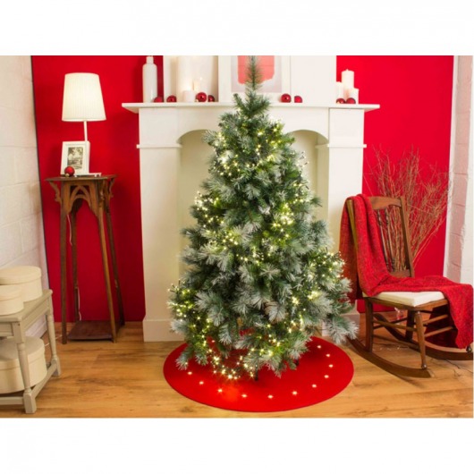Светодиодный коврик под ёлку изготовлен из фетра красного цвета. Яркая и необычная новогодняя декорация прекрасно дополнит главное дерево праздника. Мягкий белый свет светодиодов отлично сочетается с остальными ёлочными украшениями и электрогирляндами. Диаметр коврика: 100 см.