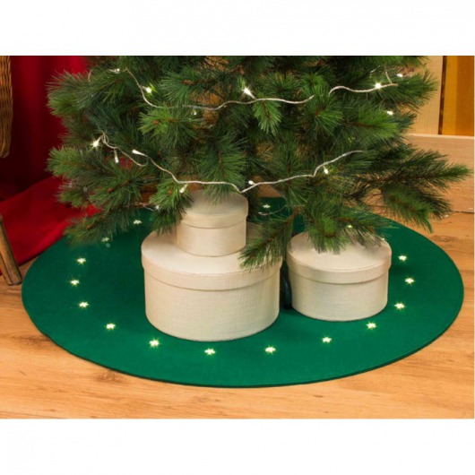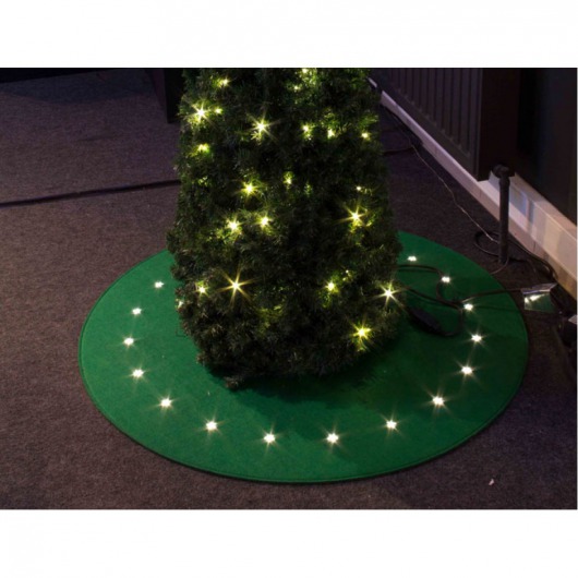 Световой коврик под ёлку изготовлен из фетра зеленого цвета. Необычная новогодняя декорация прекрасно дополнит главное дерево праздника. Мягкий белый свет светодиодов отлично сочетается с остальными ёлочными украшениями и электрогирляндами. Диаметр коврика: 100 см.