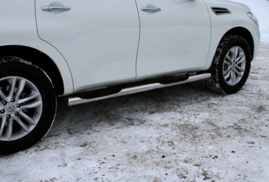 Боковые пороги-подножки сделаны специально для автомобилей Nissan Patrol от 2010 г.в., поэтому устанавливаются достаточно просто и без повреждений корпуса. Помимо этого, стальные пороги-трубы с проступями для Ниссан Патрол смотрятся очень стильно и эффектно. Они добавят вашему авто еще больше солидности и внушительности.