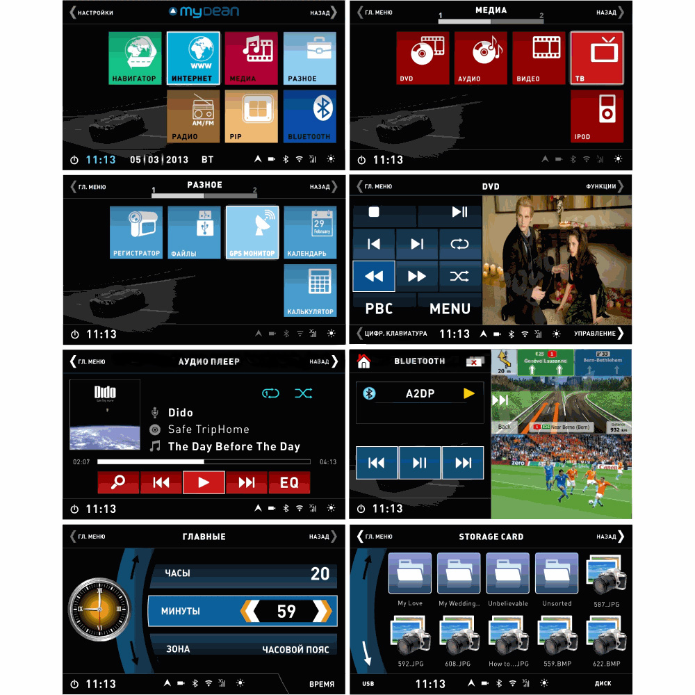 Штатная голова сделана на базе двухъядерного процессора STE семейства ARM Cortex с очень высокой производительностью. На ШГУ MyDean 3021 устанавливается операционная система WinCE 6.0 с полностью русифицированным меню. Сенсорный дисплей диагональю 7 дюймов, с разрешением 800х480 и высокой контрастностью позволяет отлично просматривать фото и видео всех основных форматов, включая видео высокой чёткости HD. Также Вы можете просматривать эфирное телевидение, для этого в штатную голову встроен аналоговый ТВ-тюнер.
