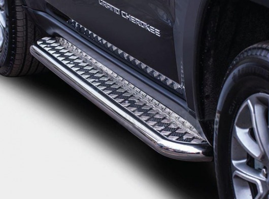 Боковые пороги-подножки сделаны специально для автомобилей Jeep Grand Cherokee от 2013 г.в., поэтому устанавливаются достаточно просто и без повреждений корпуса. Помимо этого, стальные пороги с листом для Джип Гранд Чероки смотрятся очень стильно и эффектно. Они добавят вашему авто еще больше солидности и внушительности.
