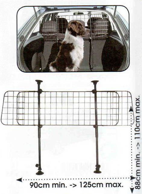 Главное преимущство металлической решетки — она состоит из центрального элемента и 2-х боковых накладок. Благодаря этому можно регулировать ширину решетки от 90 до 125 см. Высота самой решетки — 30 см. Металлическая сетка крепится на стойки — распорки между крышей и полом. Стойки оснащены резиновыми заглушками для того, чтобы не повредить обшивку потолка и пола. Кстати, металлические стойки также регулируются по высоте (от 88 до 110 см). Таким образом, разделительная сетка для животных подойдет для любого размера багажника.