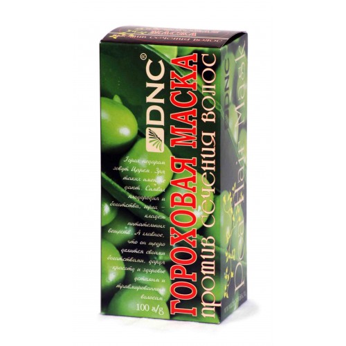 Гороховая маска против сечения волос  DNC восстанавливает усталые и травмированные волосы. Приготовленная на травяных отварах и настоях, смесь из гороховой муки и глины сотни лет назад успешно заменяла красавицам шампунь и кондиционер, питательную и восстанавливающую маску.  Гороховая маска изготовлена с добавлением протеинов молока и сои — отлично очистит волосы и напитает их целебными элементами, придав сил для роста, укрепляя, делая их более толстыми, плотными и блестящими.