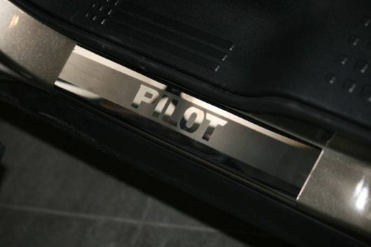 Внутренняя накладка на порог Honda Pilot  — это аксессуар автомобильного тюнинга, который защищает внутренний порог от механических повреждений при посадке и высадке из машины. Декоративные накладки с рисунком на внутренние пороги предназначены для автомобилей Honda Pilot от 2009 г.в.