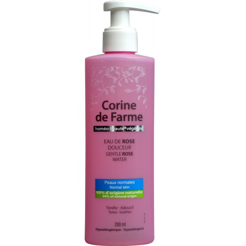 Розовая вода для снятия макияжа Corine de Farme мягко удаляет оставшиеся следы макияжа и загрязнений. Очищает, смягчает и ухаживает за кожей, не оставляет липкого ощущения. Средство подходит для чувствительной кожи и на 99% состоит из компонентов природного происхождения. Это полностью безопасное гипоаллергенное средство. Обладает восхитительным ароматом, прекрасно освежает.