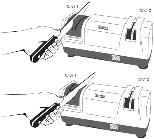Ножеточка Sititek Хозяйка 162 имеет 3 прорези: две наклонные — для обтачивания лезвия с правой и левой стороны соответственно, третья — крайняя, прямая — предназначена для окончательной доводки лезвия. Благодаря использованию в приборе современных материалов с ножа снимается минимум металла, что сохраняет его свойства на долгие годы.