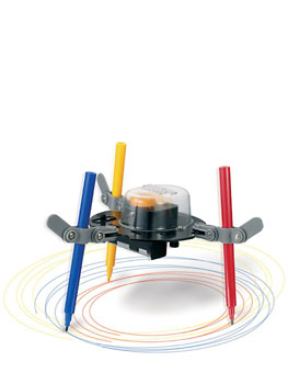 Как это работает? Батареи вырабатывают электричество для мотора, который крутит грузик на большой скорости. Центр тяжести грузика смещен от центра — он находится не на одной линии с осью мотора. При вращении грузик непрерывно толкает основание в противоположном направлении, это заставляет мотор и основание вибрировать по крошечным окружностям с большой частотой. Это также заставляет перья фломастера вибрировать вверх-вниз на бумаге. Когда перья отрываются от бумаги, циклические вибрации заставляют их двигаться дальше. Если бы перья не подпрыгивали вверх-вниз, трение о бумагу не позволило бы им двигаться.