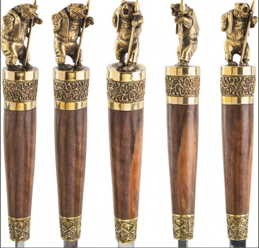 Особого внимания заслуживает ореховая рукоятка с литым бронзовым фигурным наконечником. Каждая фигурка — это автроская ювелирная работа. Ручка крупная, массивная, хорошо лежит в руке и при этом не перевешивает шампур.