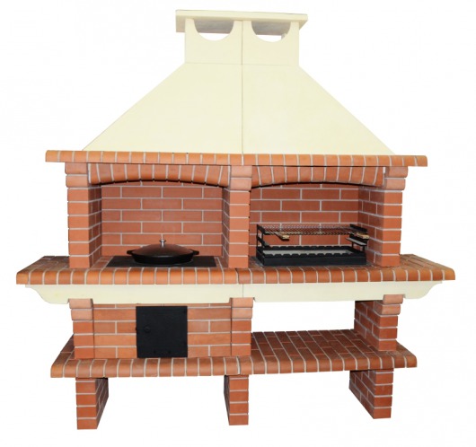 Садовая печь-барбекю из натурального кирпича Saunday 728 — лучший выбор для больших семей. Эта модель комплектуется стальным мангалом и плитой, так что вы сможете готовить 2 блюда одновременно: одно на решетке, шампурах или вертеле, другое в сковороде, казане или даже в коптильне (коптильня приобретается отдельно).