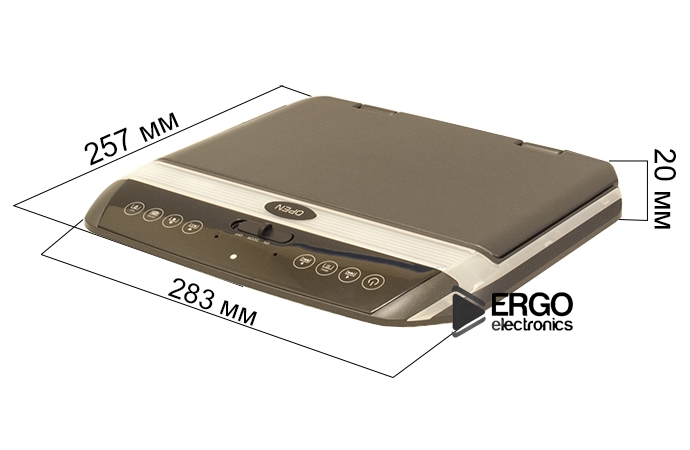 В автомобильном мониторе отсутствует DVD-привод, поэтому его толщина составляет рекордно малые 2 сантиметра. На потолке машины он будет почти незаметен. Размеры основания - 25,7х28,3 см.