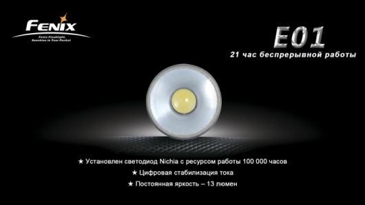 Главным преимуществом Fenix E01, которое выделяют производители, является его экономный расход энергии. От 1 заряда аккумулятора устройство способно проработать 21 ч без перерывов.