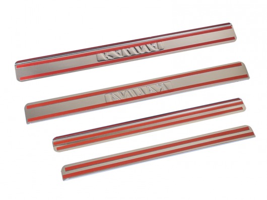 Накладки на металлические пороги дверей ВАЗ 1118 с логотипом авто не только обеспечивают защиту верхней и боковой поверхности внутреннего порога, но и отлично вписываются в интерьер автомобиля, подчеркивая его стиль и индивидуальность. C монтажом проблем не возникнет: установка накладок на внутренний порог для ВАЗ 1118 производится на штатные места с помощью скотча 3M.