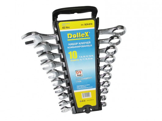 Dollex SCH-010 — это набор комбинированных гаечных ключей, состоящий из 10 инструментов  – от 7 до 22 мм. Комбинированные ключи Dollex SCH-010 хранятся в удобном пластиковом держателе, в котором все ключи расположены строго по размеру.
