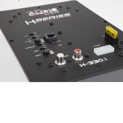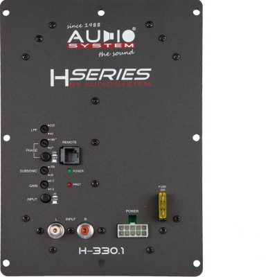 Audio System H-330.1 имеет моноблочную конструкцию и предназначен для монтажа в корпус пассивного сабвуфера. Перед установкой усилителя, сперва в корпусе сабвуфера нужно будет вырезать окно для его установки, вся панель управления остается снаружи для возможности регулировки уровня звука.